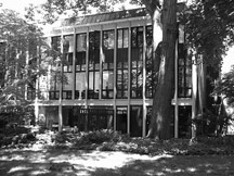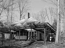 In the realm of residential design, the McDonald House of 1962 is the other Cleveland area house featured in Carol Ripkind's "A Field Guide to Contemporary American Architecture". The home's striking intersecting triple A-Frame construction reflects the pitched roofs of the Tudor-style neighborhood, but glass with dark-stained wood mullions replace the expected stucco infill and the dynamic interior space created by the roof structure make the upper floor open plan soar. Similarly, the Ford Residence of 1964 is organized by its structure - a 2 story square composed of nine 12 ft. by 12 ft. enclosed modules surrounded by an outer set of square modules which support the pyramidal roof and provide covered open areas for decks and patios. Slices are taken out of the roof structure to provide windows for the 2nd floor. The interior is dominated by the central atrium module that rises the full height of the house.